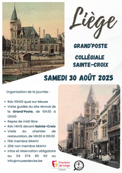 APRES-MIDI : de 14h30 à 16h30 : visite guidée du chantier de rénovation de la collégiale Sainte-Croix. Collégiale fondée par Notger il y a plus de 1000 ans et qui domine depuis le palais des princes-évêques, elle se situe dans l’angle formé par la rue Sainte-Croix et la rue Haute-Sauvenière. Classée en 1936, elle est inscrite dans la liste du patrimoine exceptionnel de la Région wallonne en 1997. En octobre 2013, elle figure sur la liste de 67 monuments en danger établie par le Fonds mondial pour les monuments. En raison de son état de délabrement, elle est fermée au public en 2005. En 2020 commencent les travaux de rénovation tant espérés…
