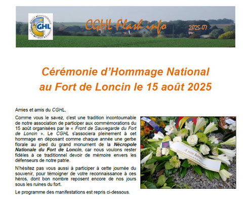 Tradition incontournable du 15 août, ces commémorations sont organisées par le Front de Sauvegarde du Fort de Loncin. Le CGHL s'associe pleinement à cet hommage en déposant comme chaque année, une gerbe florale au pied du grand monument de la « Nécropole Nationale du Fort de Loncin ». Tous nos membres sont conviés à participer à cette journée du souvenir pour témoigner de notre éternelle reconnaissance à ces héros, dont bon nombre reposent encore sous les ruines du fort…